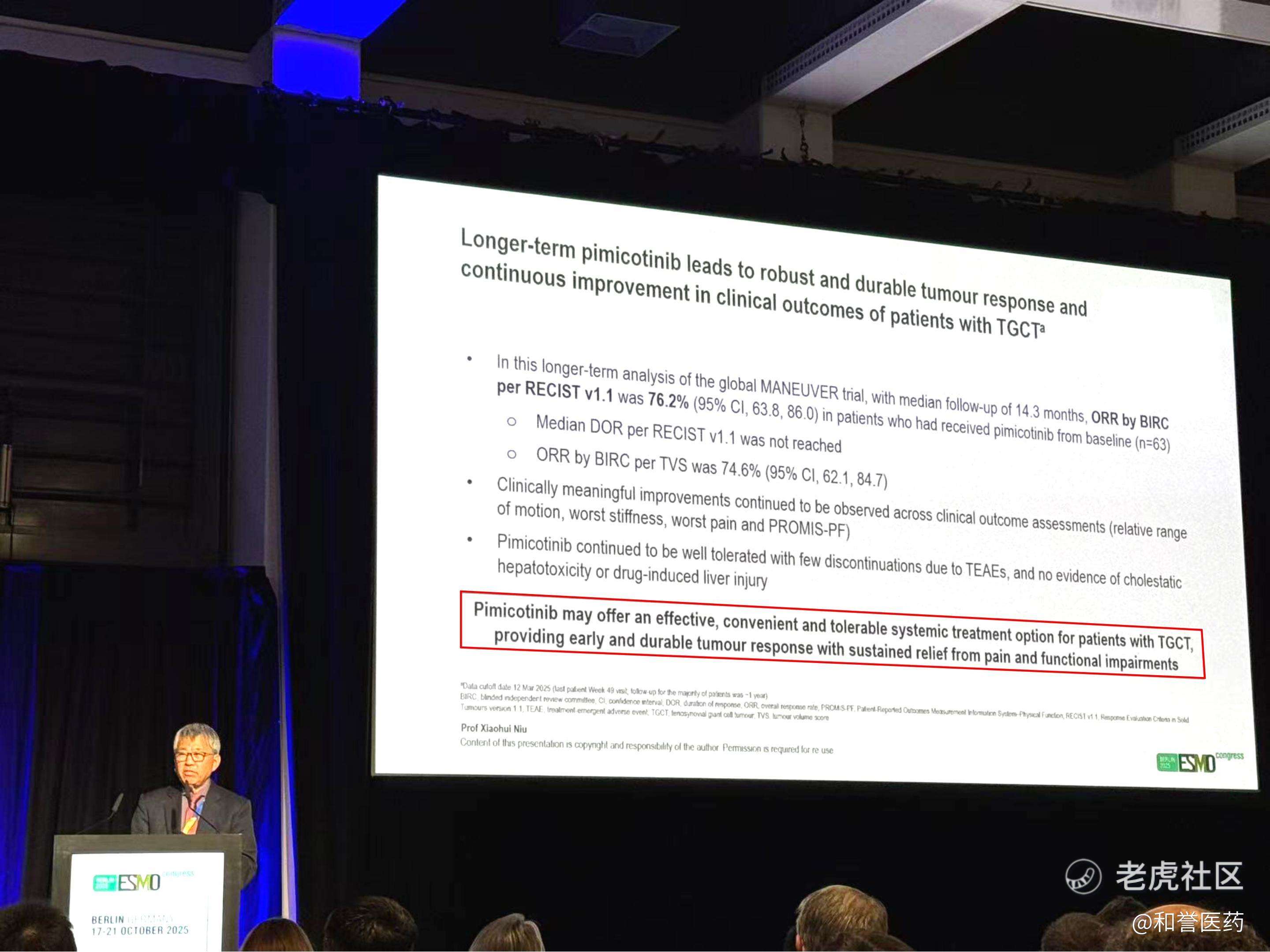 2025年10月20日,和誉医药(港交所代码:02256)宣布,公司在2025年欧洲肿瘤内科学会年会(ESMO Congress 2025)上以口头报告形式展示了其自主研发的小分子CSF-1R抑制剂匹米替尼(pimicotinib/ABSK021)治疗腱鞘巨细胞瘤(TGCT)患者的全球III期MANEUVER研究的长期疗效和安全性数据。 $和誉-B(02256)$