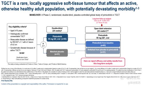 结果显示,依据RECIST v1.1标准经盲态独立评审委员会(BIRC)评估,匹米替尼在TGCT患者中展现出强劲而持久的肿瘤缓解疗效,临床结局评估(包括关节活动度、僵硬、疼痛和身体功能)表现出具有临床意义的持续改善,安全性与既往分析一致,其应用于TGCT长期治疗的可行性得到进一步验证。