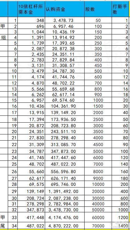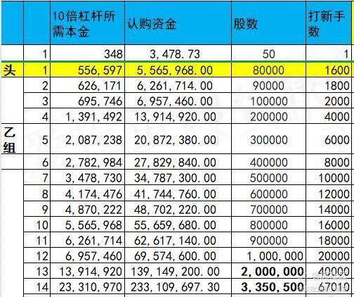 甲尾49万本金,乙头需要认购资金557万,乙组的各档融资所需要的本金还有融资金额对应如下表: