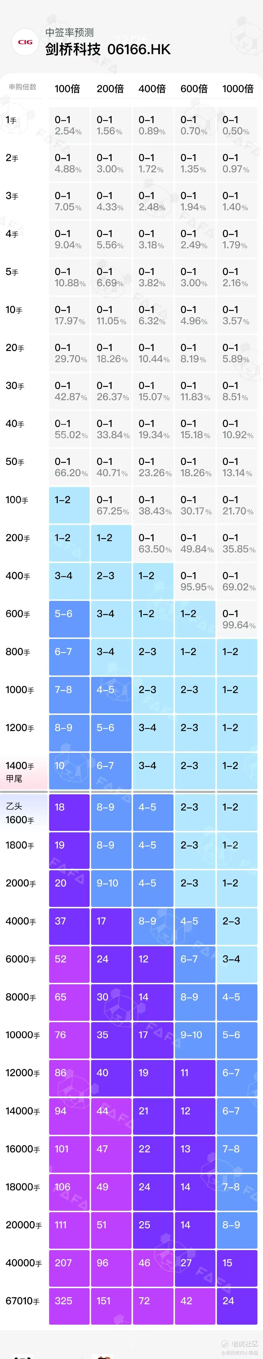 关于一手中签率方面,无论孖展多少倍,剑桥科技本次公开发售仅占10%,无回拨空间,按照20万人来参与预估一下,一手中签率最好的情况也不超过2%。