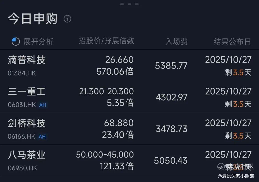 今天4个票所有券商都只能4选1,不能同时打,大概率4个票都能吃肉,大家都有美好的未来,无非就是肉多肉少的问题,这也要结合着中签率来,可能涨得最少的不一定是挣的最少了,也可能中签数量会比较多,或者更加容易中签,很多时候只有同时招股冲突了才有利润空间的。所以每个至少都要现金免费去参与一手,你一定要选择全都要,不中签只要没费用就都可以,万一狗屎运给中签那鸡腿钱就回来了。只是融资认购毕竟要付那100手续费那就得挑几个去打。