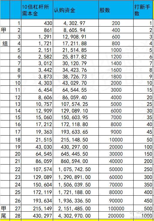 甲组的各档融资所需要的本金还有融资金额对应如下表: