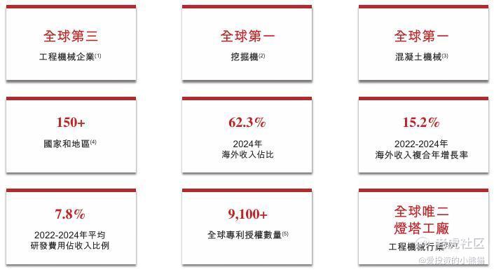 三一重工成立于1994年,是创新驱动的全球工程机械行业领军企业。公司专注于挖掘机械、混凝土机械、起重机械、桩工机械及路面机械等全系列工程机械产品的研发、制造、销售及服务。按2020年至2024年核心工程机械产品的累计收入计算,公司是全球第三大及中国最大的工程机械企业。于往绩记录期间,公司的产品已销往全球150多个国家和地区,截至2025年4月30日止四个月,公司来自海外市场的收入占总收入的57.4%。公司的产品备受全球客户信赖,凭借先进的技术实力与性能,广泛参与多项全球标志性项目的施工建设,如港珠澳大桥、伦敦奥运场馆、迪拜塔、北京奥运场馆等。