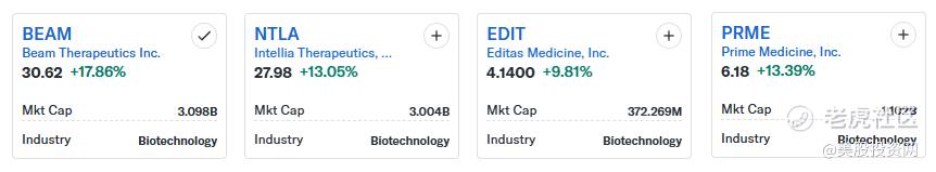 相关公司BEAM +17.86% , NTLA +13.05% ,EDIT +9.81% ,PRME +13.39%。