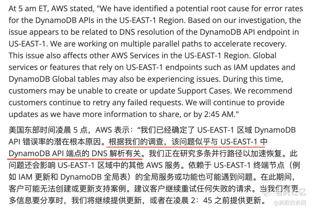 美国东部时间 10 月 20 日 凌晨 3:10 (ET),全球最大云计算服务商之一——Amazon Web Services(AWS,隶属于亚马逊)在其最关键的数据中心区域——美国东部一区(US-EAST-1,北弗吉尼亚)突发严重服务故障。