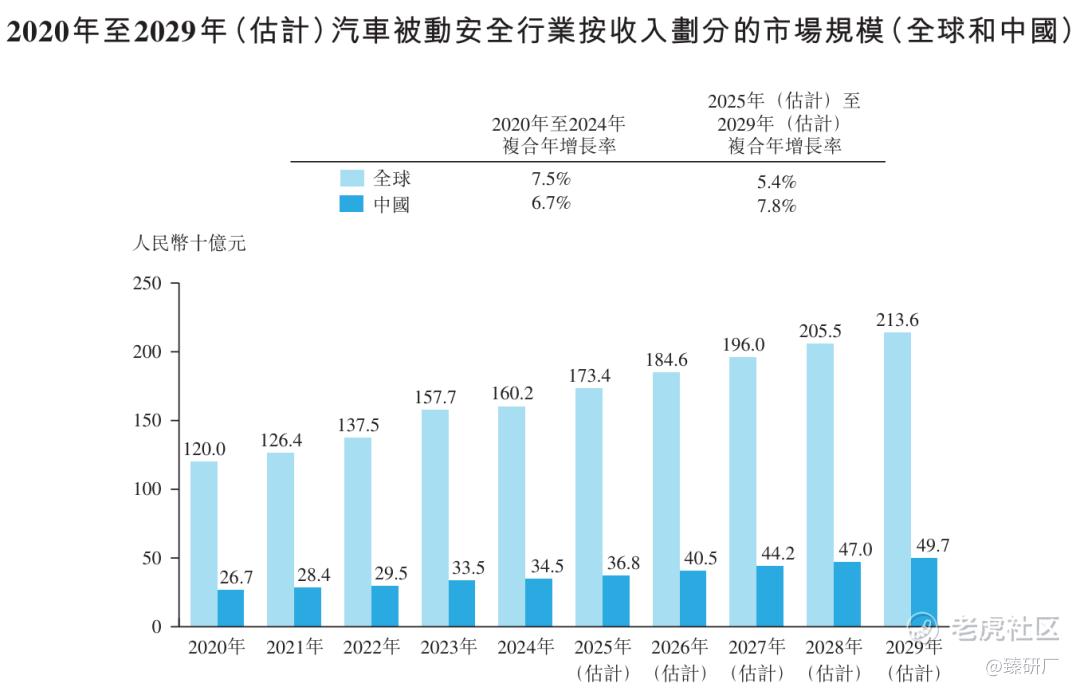 全球汽车被动安全行业的市场规模从2020年的人民币1,200亿元增至2024年的人民币1,602亿元。展望未来,随着安全标准的不断加强和汽车制造商对汽车安全性能的日益重视,市场有望保持稳定增长。预计全球汽车被动安全行业的市场规模将增长到2029年的人民币2,136亿元,自2025年的复合年增长率为5.4%。中国汽车被动安全行业的市场规模从2020年的人民币267亿元增至2024年的人民币345亿元。预计市场规模将达至2029年的人民币497亿元,自2025年的复合年增长率为7.8%。