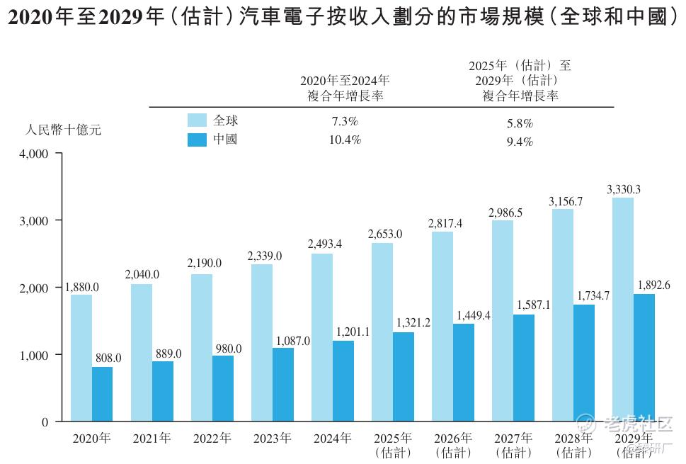 汽车电子是汽车行业和智能汽车科技解决方案的重要组成部分,使智能座舱、智能驾驶和智能网联等先进技术得以应用,从而在推动行业向汽车智能化全面转型方面发挥重要作用。汽车电子的市场规模持续向上增长,尤其是在推广智能座舱、智能驾驶和智能网联解决方案方面。2024年,全球和中国汽车电子市场分别达到人民币24,934亿元和人民币12,011亿元。展望未来,汽车智能化的发展预期将进一步带动对汽车电子的需求,并因而推动市场增长。预期到2029年,全球和中国汽车电子行业的市场规模将分别增至人民币33,303亿元和人民币18,926亿元,自2025年起的复合年增长率将分别为5.8%和9.4%。