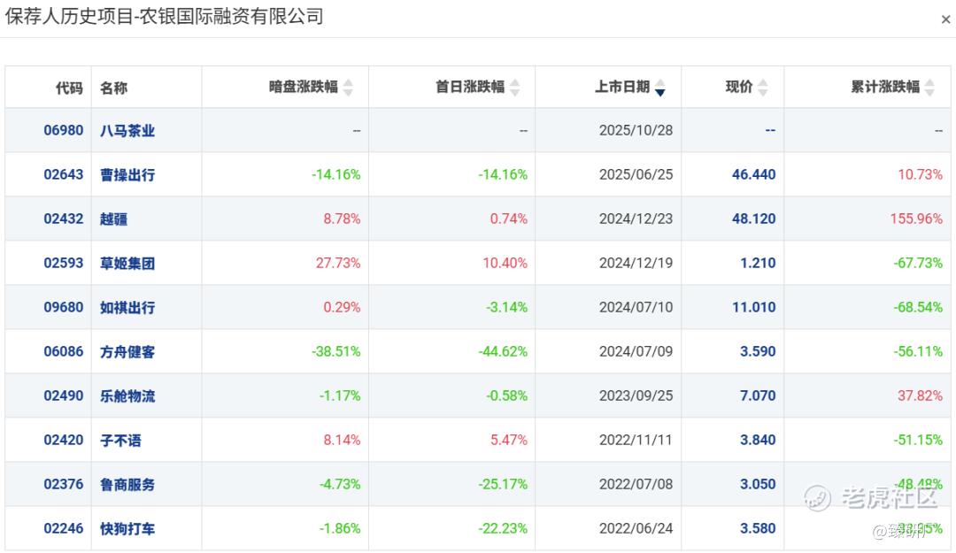 农银国际历史上作为保荐人参与了43个项目,其中暗盘有20家公司上涨,21家公司下跌,2家公司平盘,暗盘破发率48.84%,首日有21家公司上涨,14家公司下跌,8家公司平盘,破发率32.56%。八马茶业是农银国际港股IPO84新规后保荐的第一支新股。