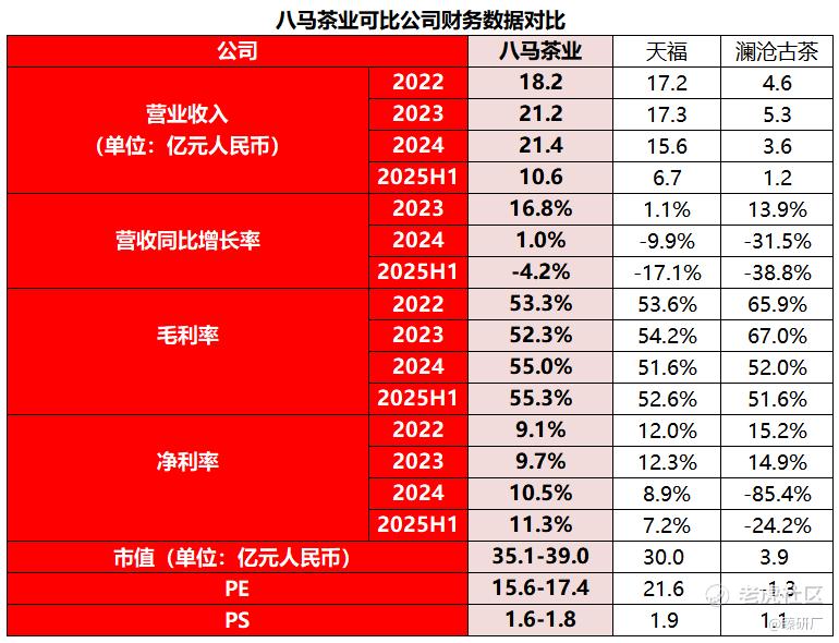 从估值来看,按此次发行估值计算,八马茶业的PE为15.6-17.4倍,低于天福的21.6倍,PS为1.6-1.8倍,低于天福的1.9倍,高于澜沧古茶的1.1倍,考虑到八马茶业的基本面显著优于两者,其估值位于合理区间,定价并不贵。