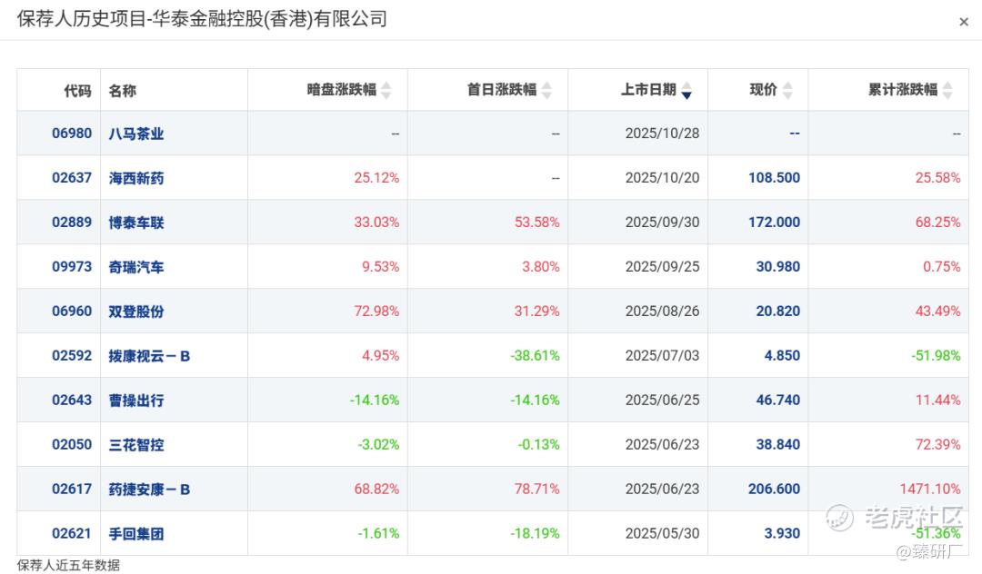 华泰历史上作为保荐人参与了59个项目,其中暗盘有30家公司上涨,26家公司下跌,3家公司平盘,破发率44.07%;首日有26家公司上涨,25家公司下跌,8家公司平盘,破发率42.37%。华泰过往作为主保荐人的项目破发率较高,新规后机制B发行的股票无一破发,涨幅较高,即便保荐人里有华泰也无伤大雅,但上周由华泰保荐的海西新药暗盘高开低走,涨幅由103.7%跌至25.12%,上市首日收盘涨幅也仅20.6%,这还是在今天大盘整体表现较好的情况下,若是没有延期,在上周五正常上市,甚至有破发的风险,不禁让人怀疑华泰是否又要重拾其“破发专业户”的头衔。