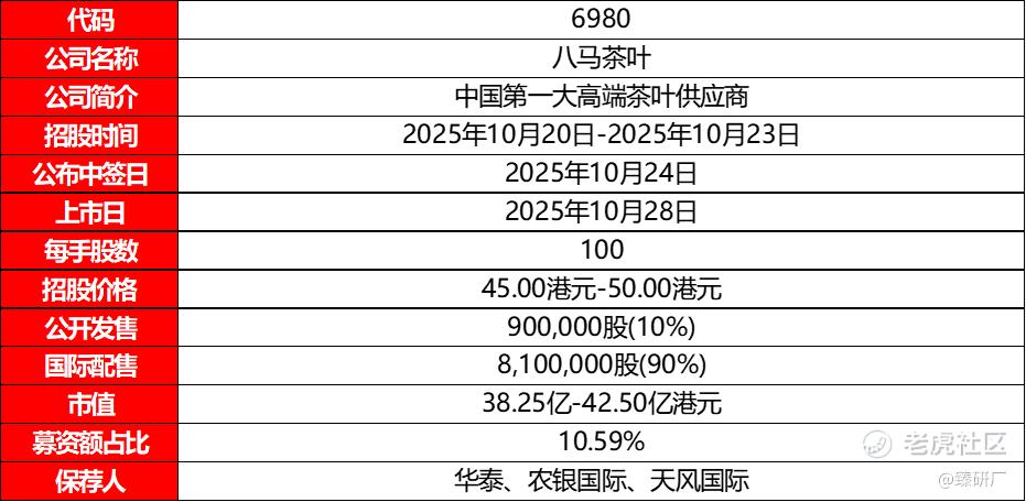 从市场情绪来看,目前机制B新股仍无一破发,但涨幅已大幅下降,新上市的云迹、海西、聚水潭上市首日涨幅均不足50%,机制B带来的抢筹效应已慢慢褪去,市场已经开始慢慢恢复理智。此次还有三只新股与八马茶业一同开启招股,其中滴普科技孖展倍数已破千,八马茶业排名第二,截至21日13:50超购253.95倍,可以看出当前港股市场还是更偏好科技标的。此次发行公配仅9,000手,中签难度较大,感兴趣的投资者可以持续关注八马茶业的后续孖展动态,理性申购。
