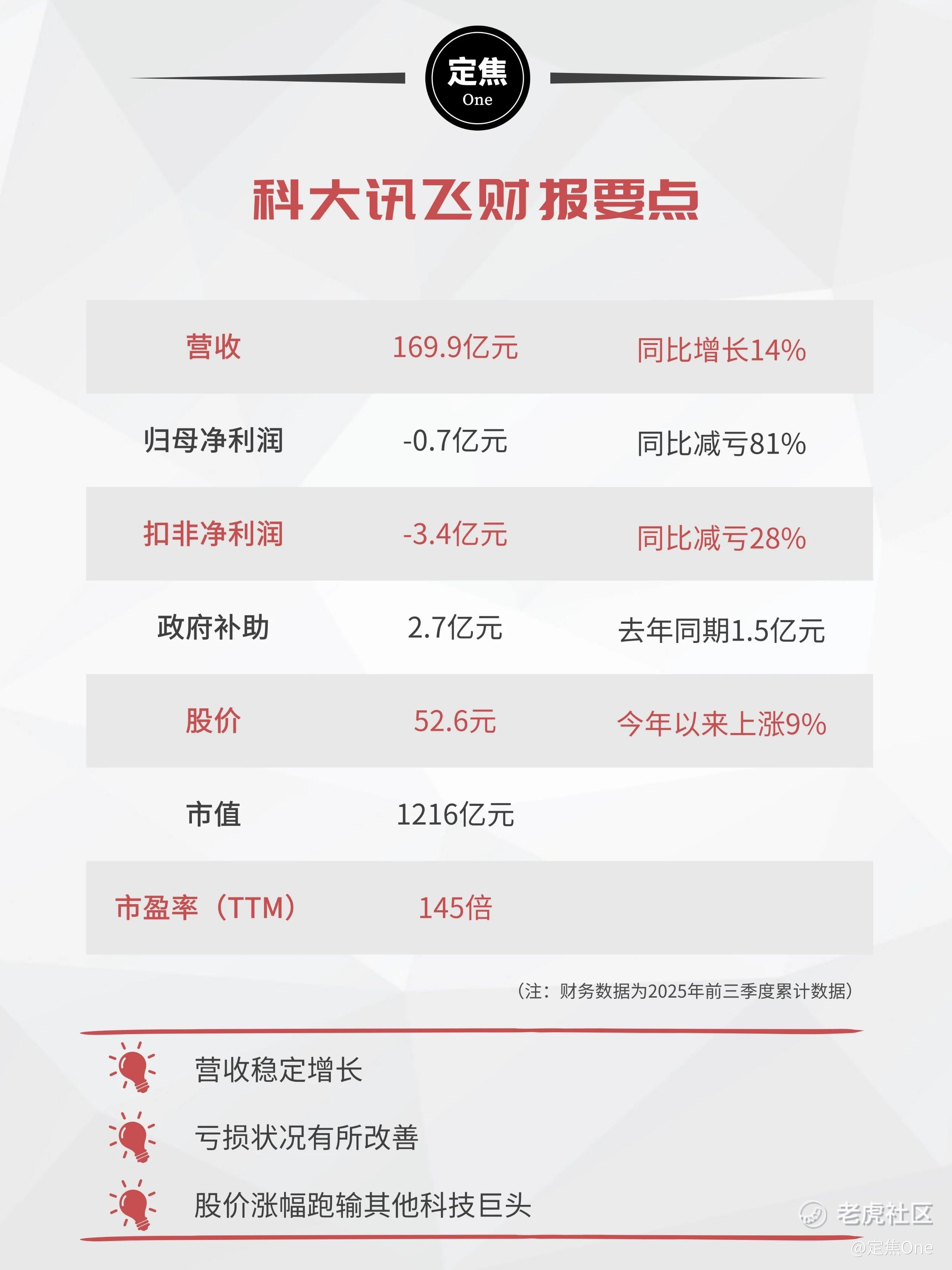 10月20日,科大讯飞发布了2025年第三季度财报。今年前三季度,科大讯飞营收169.9亿元,同比增长14%;归母净利润-0.7亿元,同比减亏81%。