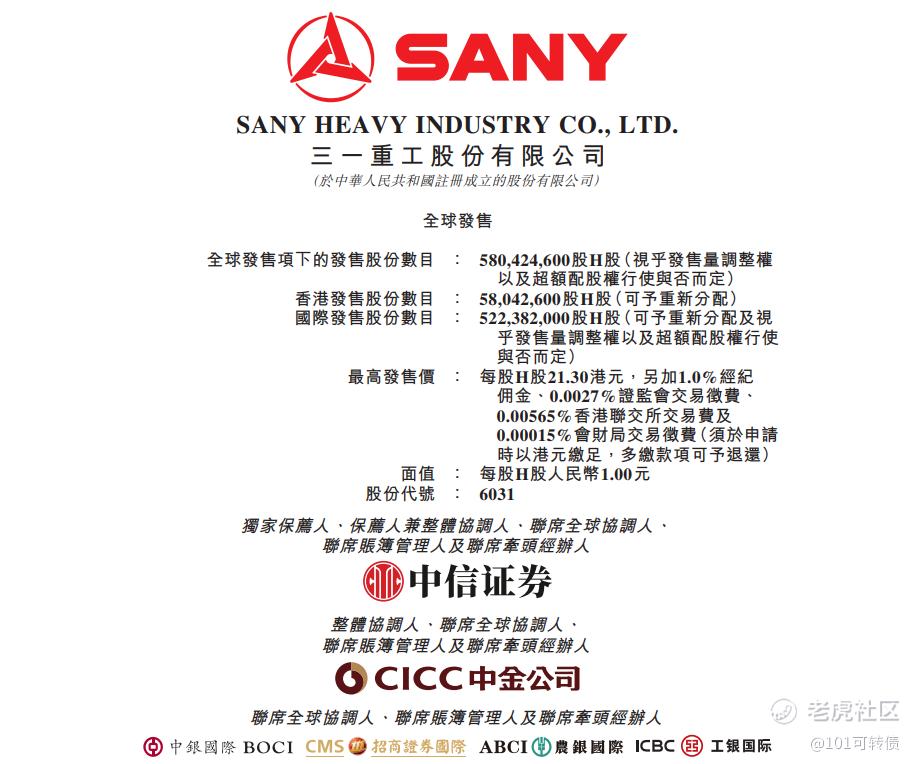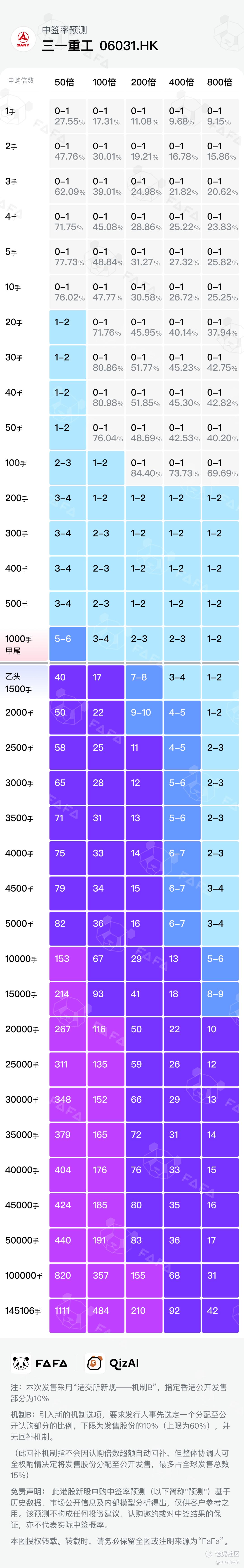 三一重工通此次招股采用机制B,回拨10%,公开发售5804.26万股,每手200股,共290213手,参考紫金黄金国际的中签率,目前孖展是不到50倍,预计最终孖展在200倍左右。由中信独家保荐,稳价人由中信里昂,中信哥的实力大家都是有目同睹的!!!有基石,有绿鞋,三一重工基本面好,行业前景也不错,基石投资者认购(包括淡马锡、盈峰资本、高瓴资本、瑞银、贝莱德、惠理等知名机构,约占发售股份的48.86%。)也很强悍;目前折价在15-20%,预计三一重工涨幅可能在5%-8%之间。