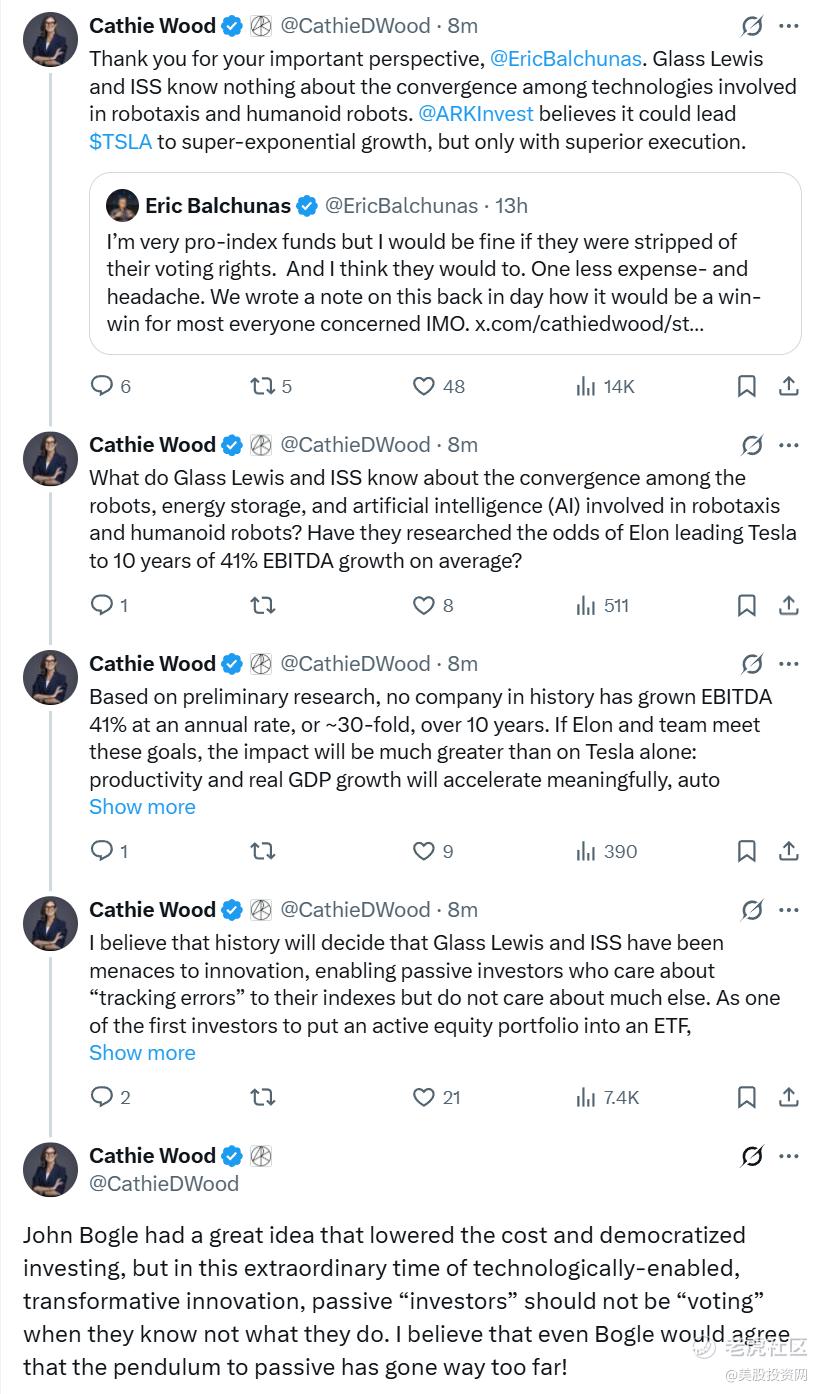 她同时呼吁,应限制被动投资者(passive investors)的投票权,认为“被动投资浪潮已走得太远”,传统机构对技术变革缺乏理解,资本决策权应更多交还给懂科技、敢冒险的主动投资者。