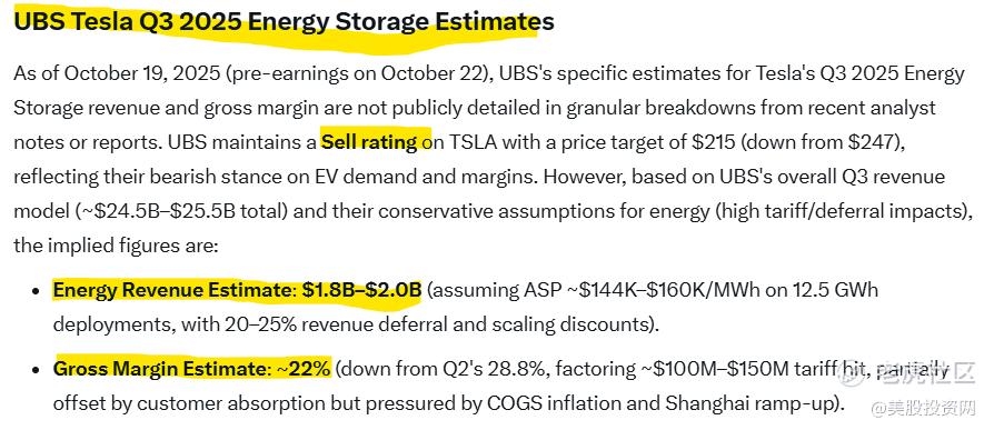 值得注意的是,机构预期亦印证了这一趋势。UBS(瑞银)在10月19日的研报中预计,特斯拉Q3能源板块收入将在18亿至20亿美元之间,毛利率约为22%,虽较Q2的28.8%略有下滑,但依然远高于汽车业务水平。瑞银指出,能源板块正成为特斯拉新的结构性支撑,部分抵消汽车业务利润下滑的影响。