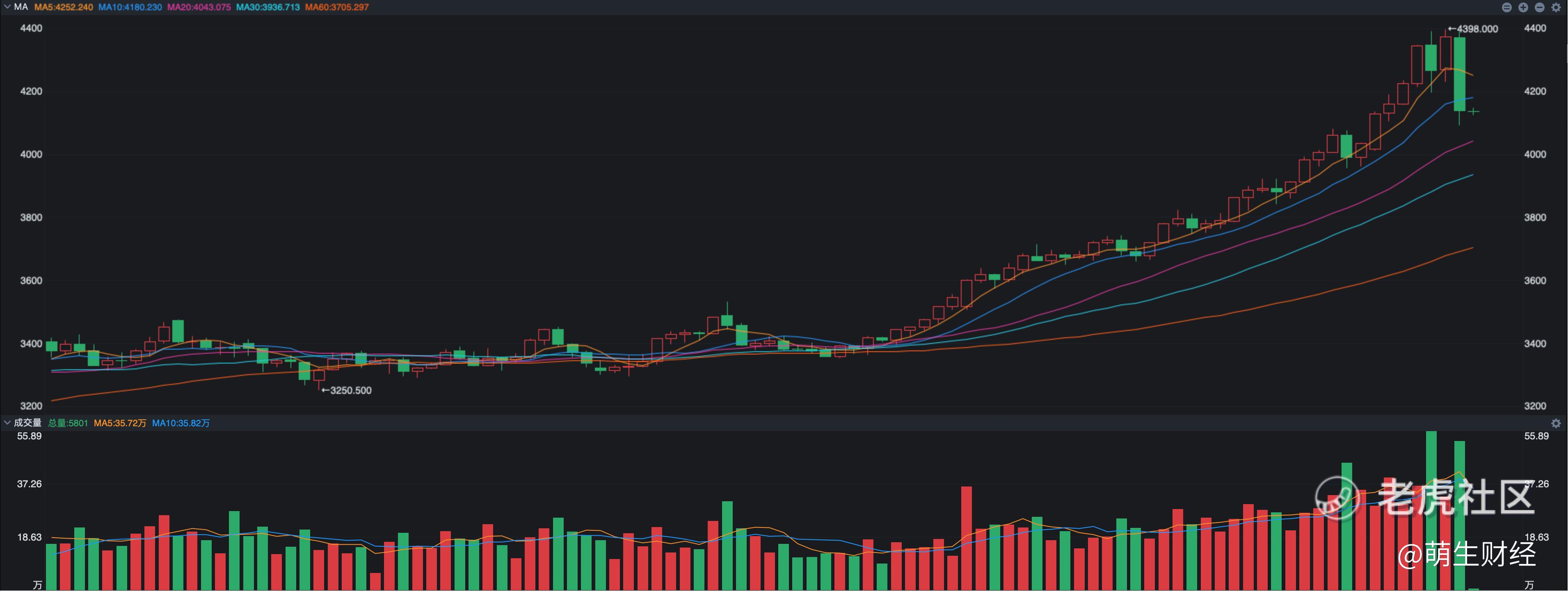 现在的关键问题是,这波金价到底能调整到哪里呢?我觉得短期内先看20日线支撑,也就是4000美元每盎司,主要是看在这个位置,市场的主动性买盘会不会出现,如果说4000美元无法获得比较强的买盘,那下一个目标位就是3800美元一带了,也就是现在的60日线附近。