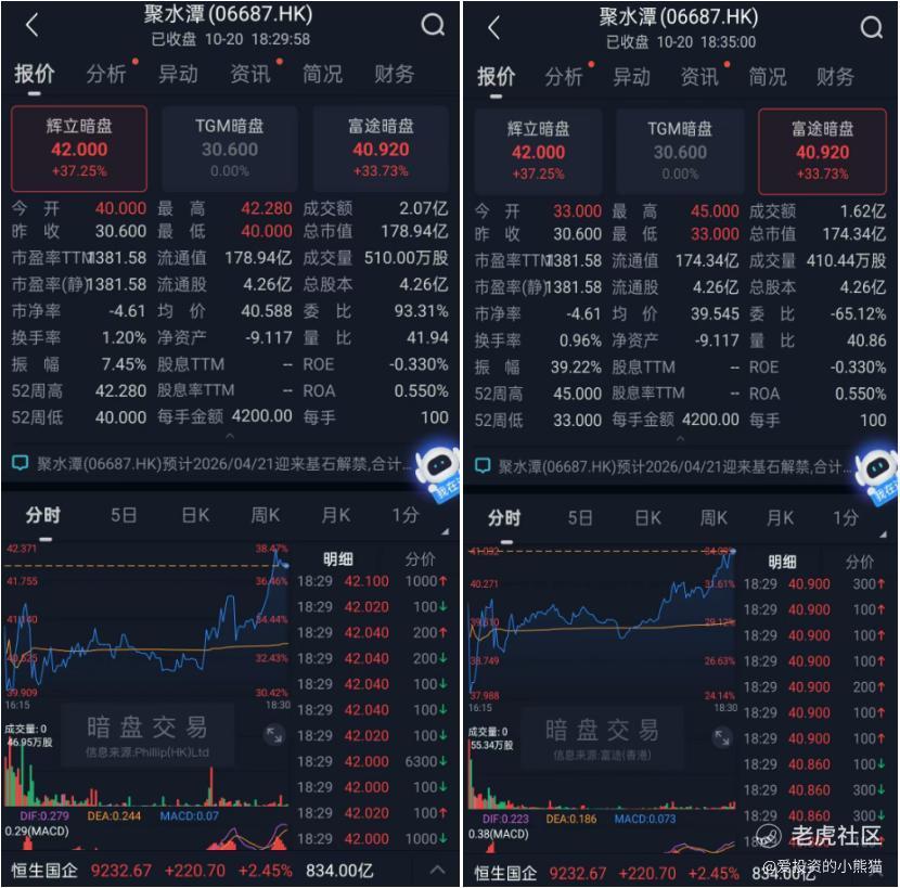 聚水潭(06687.HK)辉立暗盘以最低点40.00港元高开,震荡上升,最高摸到42.28港元,尾盘以42.00港元报收,涨幅为37.25%,振幅7.45%,成交2.07亿港元。