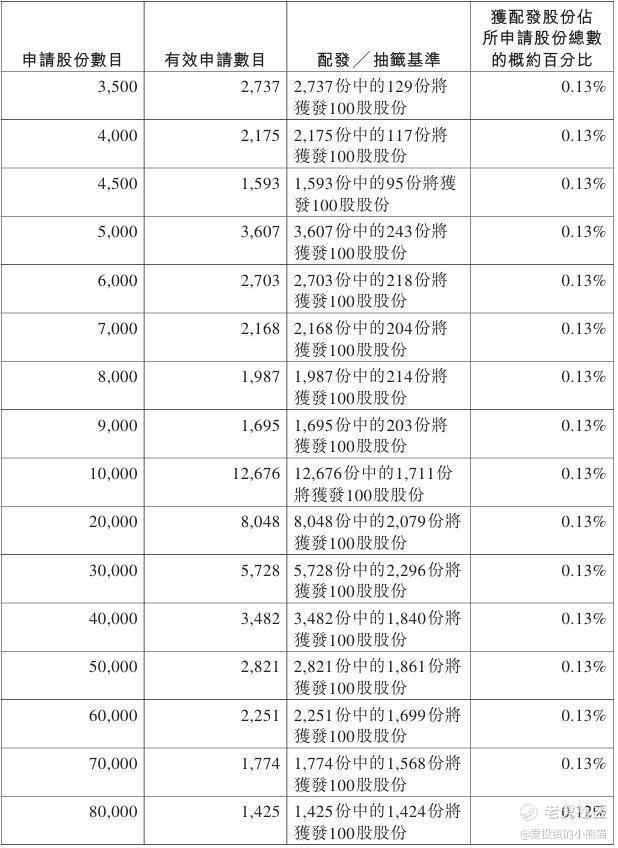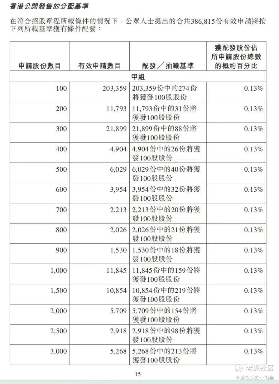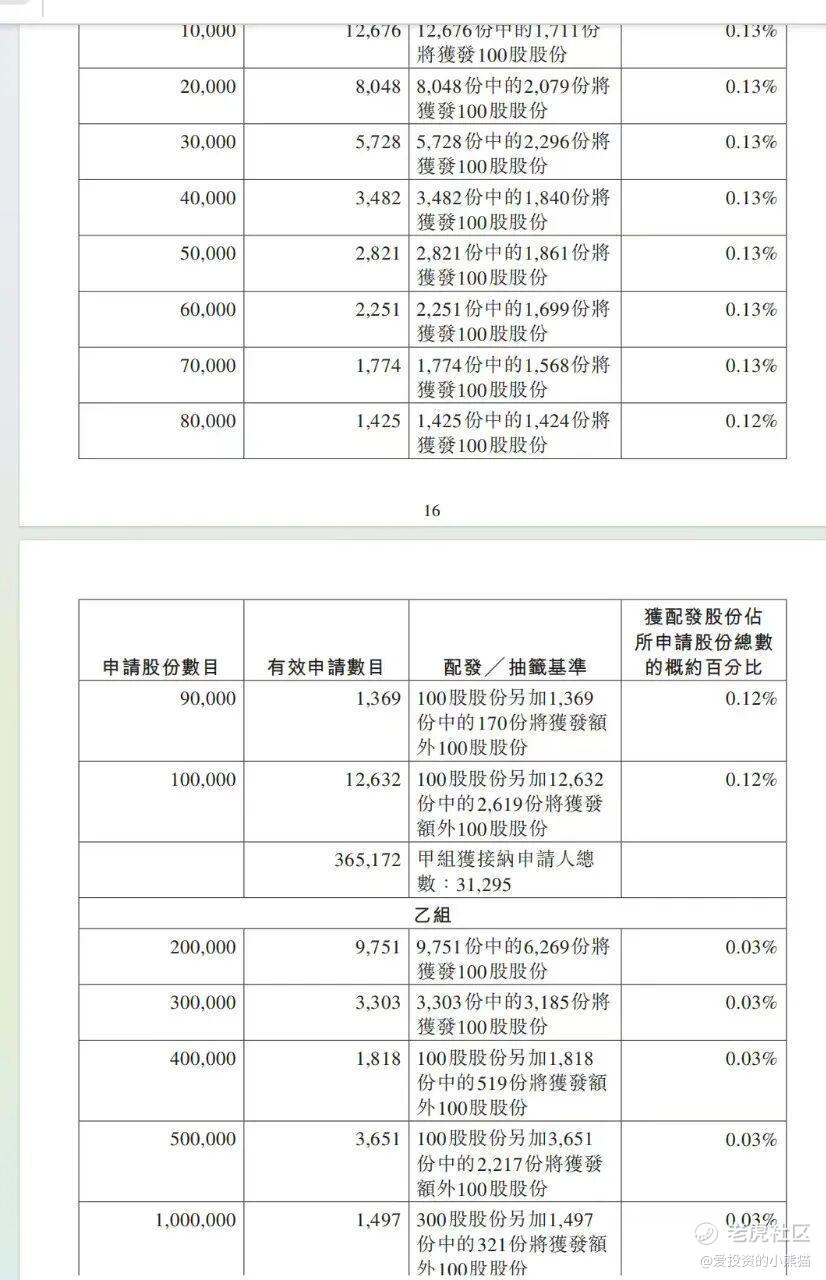 $聚水潭(06687)$ ,这一次的分配制度比较利于融资打新的小伙伴了,一手中签率0.13%,每一档都是同一中签签率,把这20万多个一手党全部杀死了。猴子们终于输一次啊。