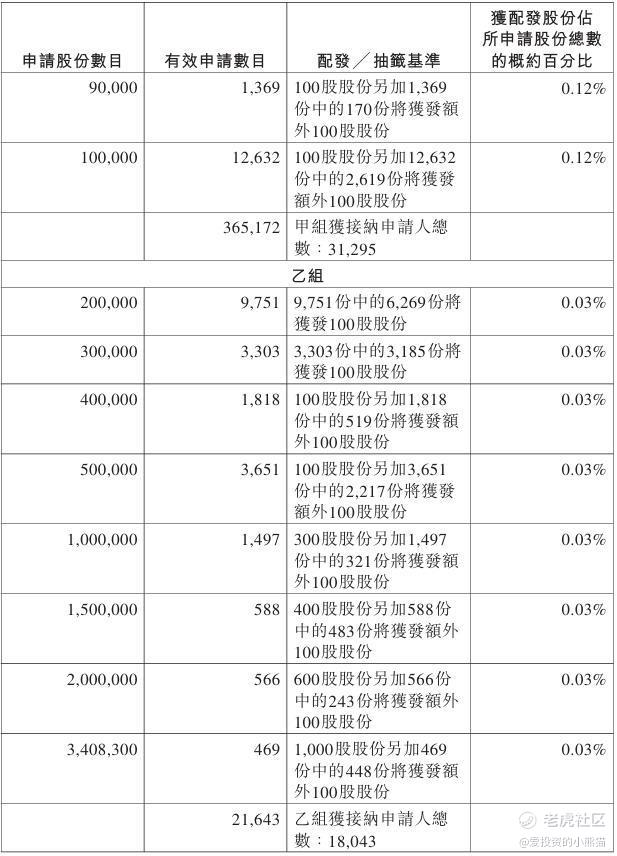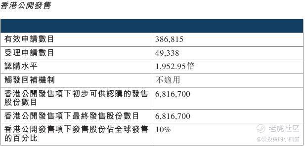 配售情况:386815人认购,这次公配1952.95倍,十分火热,由于执行分配机制B, 回拨比率无,国配有22.89倍,一手中签率0.13%,认购900手稳中1手,同时乙组21643人申购,其中顶头槌申购469张,获配率0.03%。