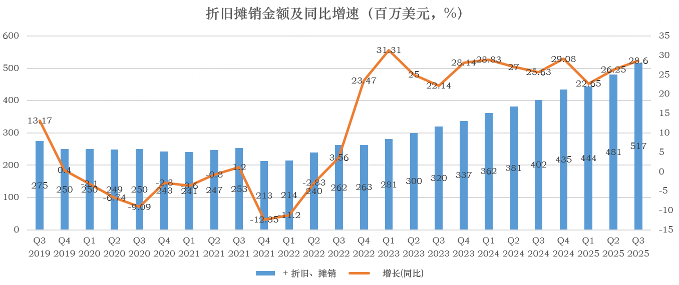 大额投资建厂带来巨额生产设备折旧,三季度折旧及摊销金额达到5.17亿美元,同比增长28.6%: