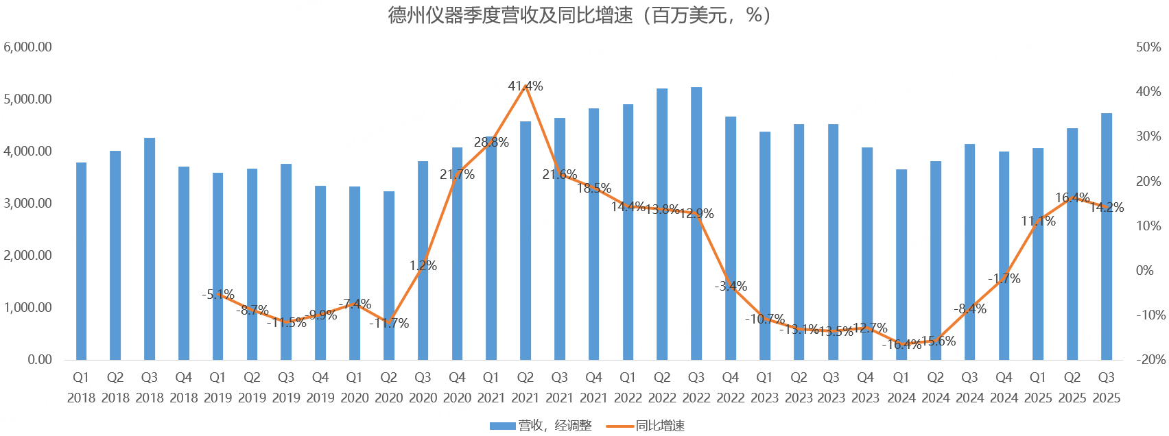 从三季度来看,德州仪器营收达到了47.4亿美元,同比增长14.2%,略高于分析师预期的46.6亿: