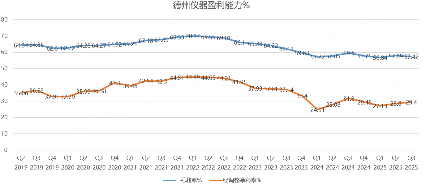 但是,虽然收入端复苏了,但从利润端来看,德州仪器的表现不太好,其中,三季度毛利率57.4%,比去年同期低了2个百分点;经调整净利率29.4%,比去年同期低了2.4个百分点: