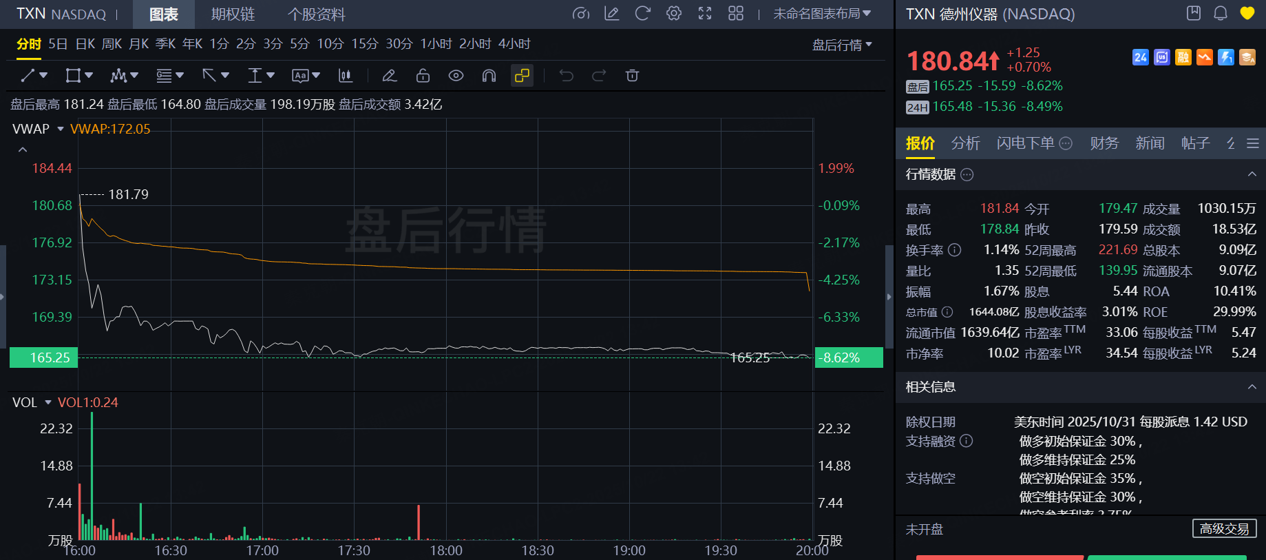 谨慎表态及令人失望的四季度指引导致盘后股价大跌,德州仪器摔的不怨。