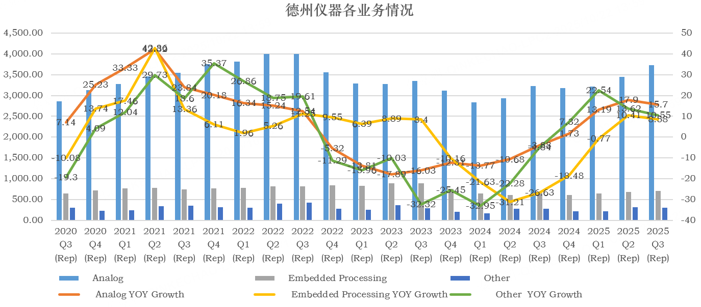 分业务看,德州仪器三季度三大业务悉数实现增长,其中,模拟芯片同比增长15.7%、嵌入式同比增长8.6%、其他同比增长10.6%: