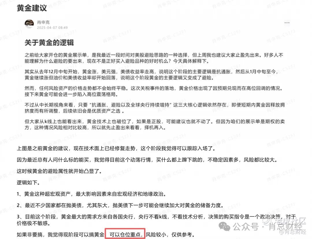 再说回黄金,昨晚崩盘后,各投行机构和自媒体就开始马后炮找跌的理由了,什么俄乌停火预期导致黄金避险属性减弱;什么关税毛衣战又开始缓和等等。
