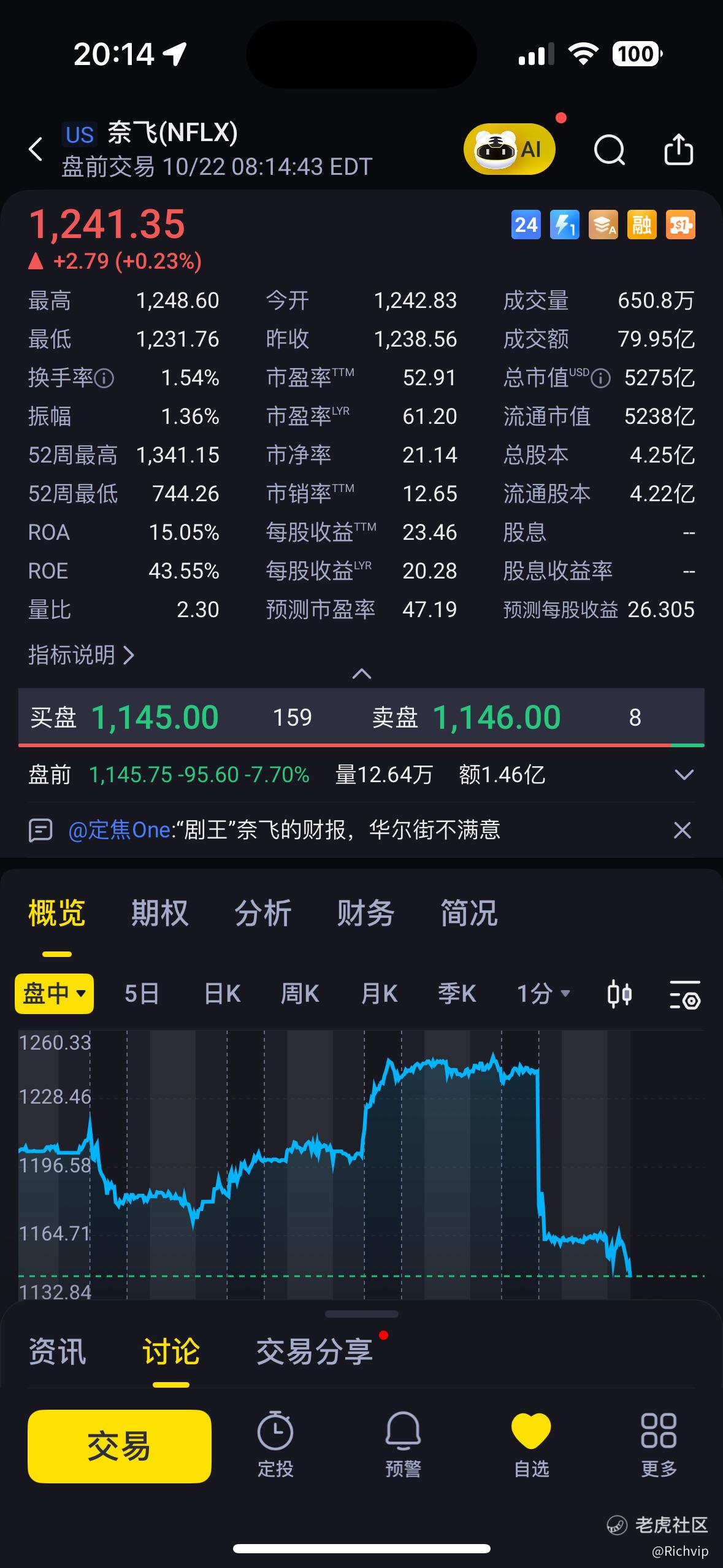 我认为瑕不掩瑜;巴西税收问题第二季度就已经存在,只是第三季度一次性记提。只是因为市场处于高位,任何个股一点瑕疵都会被市场过度反应。奈飞未平仓期权中1160有大量未平仓期权,此处短期有强力支撑。