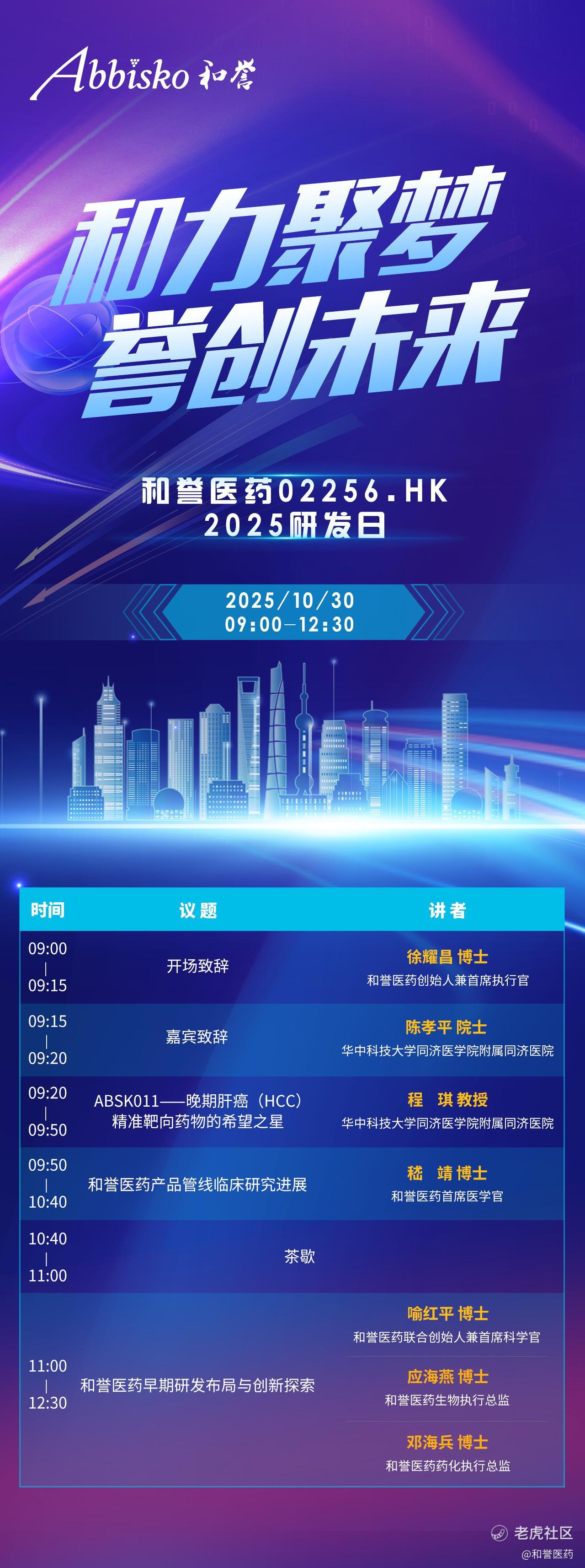 2025年10月30日,和誉医药将于上海举办“和力聚梦 誉创未来”——和誉医药02256.HK 2025研发日。本次活动全程线上直播,和誉医药管理层、研发团队以及临床专家将分享公司核心临床管线及早研项目的最新进展。诚邀各界伙伴、投资者及媒体朋友莅临本次活动,与和誉共启发展新篇章。 $和誉-B(02256)$
