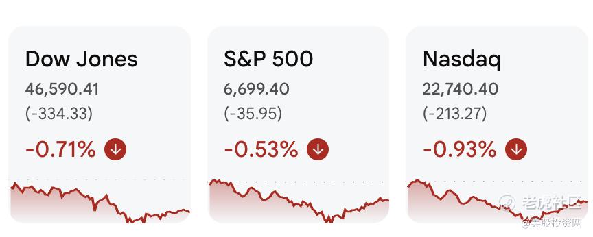 周三美股市场最初的下行压力主要源于公司盈利前景的担忧。奈飞( $奈飞(NFLX)$ )第三季度盈利远逊于市场预期,并下调了全年业绩指引,开盘即暴跌超7%,收盘时跌幅扩大至10%,原因在于与巴西税务机构的纠纷拖累了其财报表现,这无疑给本已脆弱的投资者信心带来了沉重打击。