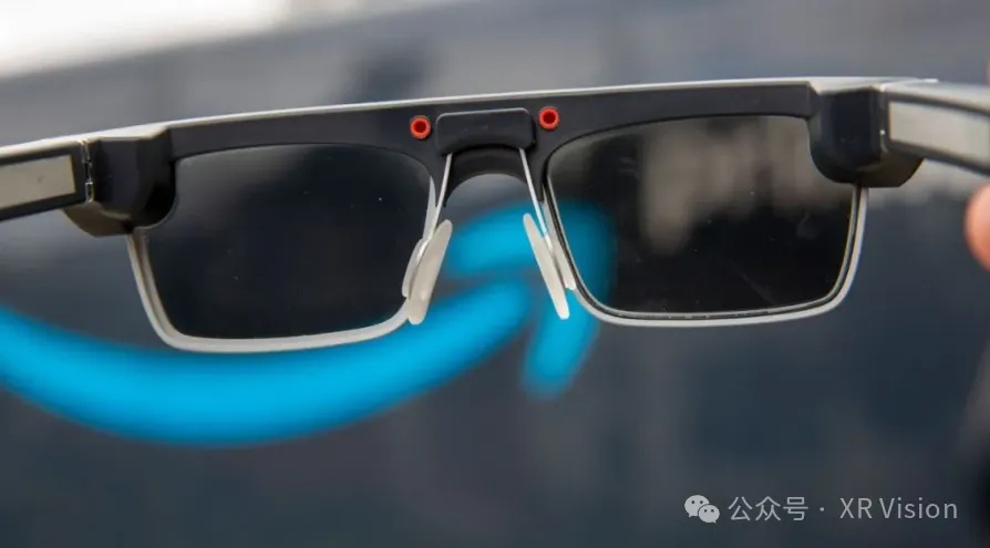 从眼镜外观来看,光机位于镜腿上面,没有采用的一拖二的显示方案,笔者猜测可能是采用了单目的显示方案。