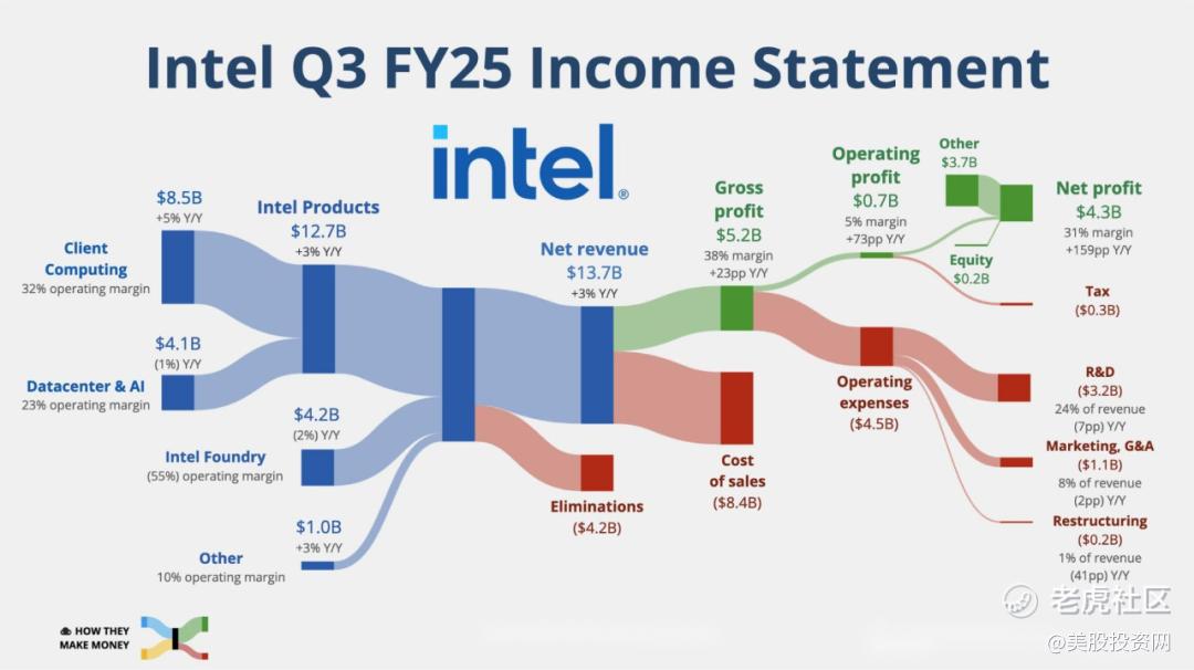 此外,外部战略支持为英特尔的复苏提供了坚实的后盾。财报披露,英特尔在第三季度获得了Z府提供的57亿美元投资,这是其89亿美元资金支持的一部分,旨在支持其在美国本土的制造扩张。同时,英特尔预计与英伟达达成的50亿美元普通股投资协议也将在四季度末前完成。