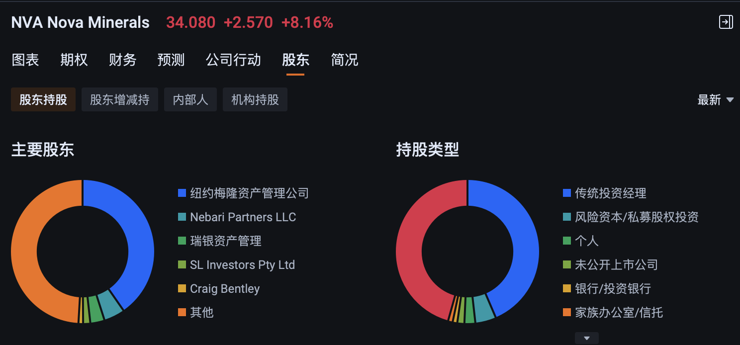 最近NVA跌麻了,作为一名8年美股老韭菜,有点自我怀疑了,曾经在所有人最不看好NIO的时候3美金成本建仓,50+美金跑掉,现在遇到NVA却有点手足无措,明明知道被低估了,但是市场就是不认可,最后看到纽约梅隆资管是第一大股东持股40%(2025-10-7)后,心里稍许安慰,承认自己不懂矿业类股票,就跟着大股东走吧~$Nova Minerals Ltd.(NVA)$ $MP Materials Corp.(MP)$ $纽约梅隆银行(BK)$