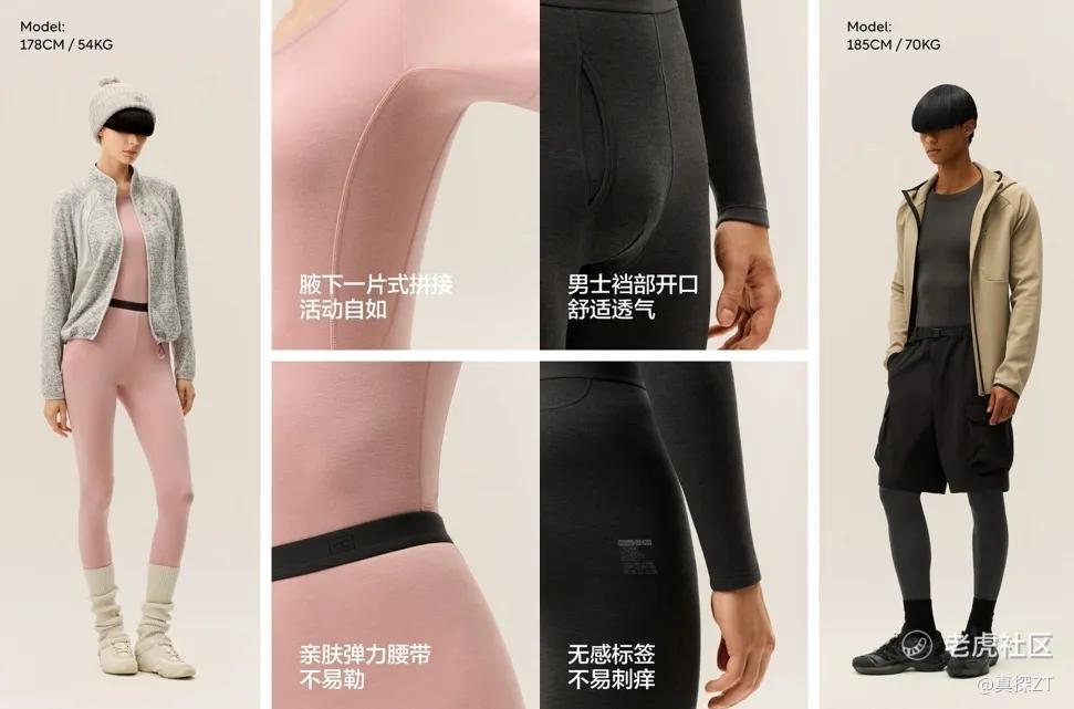7系则采用超细羊毛、腈纶和中空涤纶,搭配进口莱卡面料组合。超细羊毛的应用不仅能增强锁温能力,也能提供更柔和的触感体验;而中空涤纶、腈纶的蓬松构造,能在更轻克重的基础上实现更好的保暖效果,避免内衣显得过于臃肿、笨重。