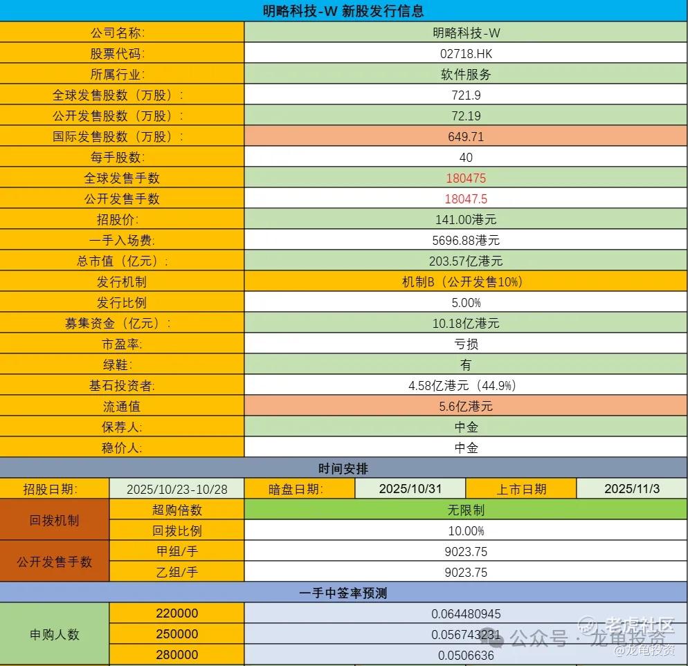 公司全球发售股数721.9万股,每手股数40股;截至发稿,超购14.91倍,采用机制B发行,甲乙组各9023.75手,预计22-28万人参与,一手中签率0.06%,申购2500手稳一手。