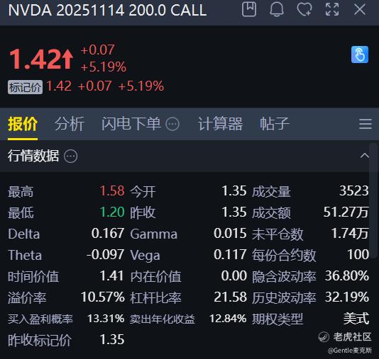 假设我们我持有100股英伟达的股票,现在卖出一张行权价200美元、三周后到期的看涨期权,获得了约1.42美元/股的权利金。