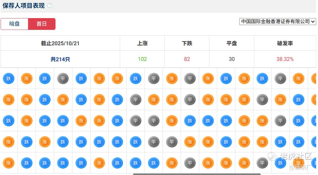 中金历史上作为保荐人参与了214个项目,其中暗盘有96家公司上涨,92家公司下跌,26家公司平盘,破发率42.99%;首日有102家公司上涨,82家公司下跌,30家公司平盘,破发率38.32%。
