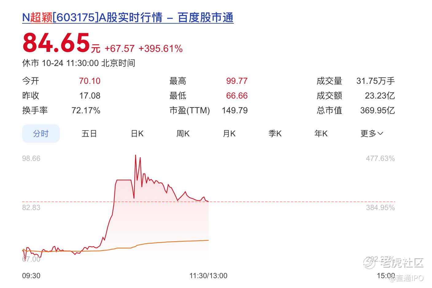 开盘,超颖电子暴涨310.42%报70.1元/股,总市值306.4亿元。截至午间休市,超颖电子涨395.61%报84.65元/股,总市值369.95亿元,盘中最高达99.77元/股。