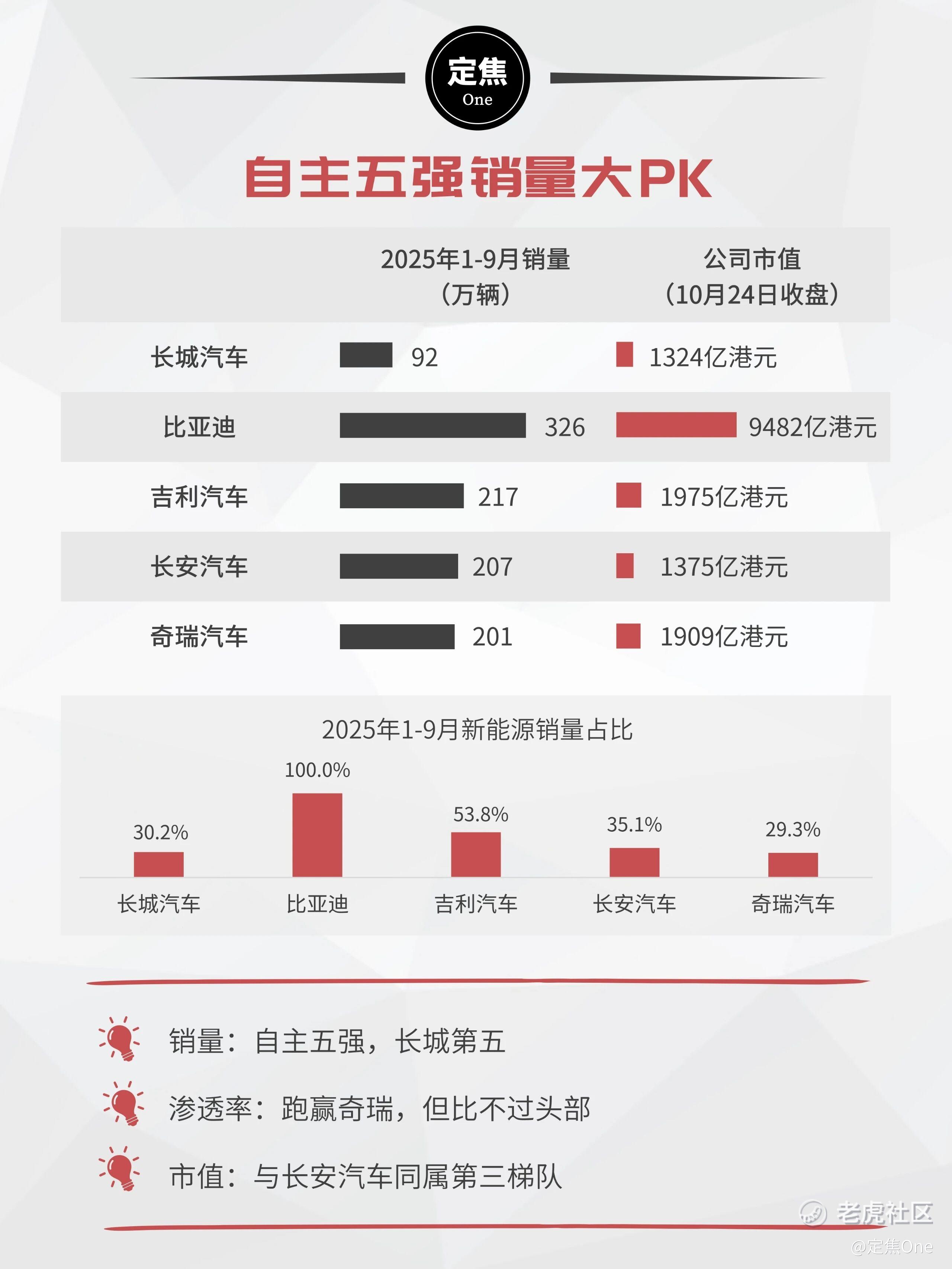 最后,我们看长城汽车在自主品牌阵营中的位置。从前三季度的销量来看,它在自主五强中排名第五。长城汽车也并非毫无亮点,它的新能源渗透率超过了奇瑞汽车。 这说明,在激烈的市场竞争中,长城汽车的压力不小,虽然转型有所成效,但要重新杀回自主品牌前三的阵营,避免被头部企业进一步拉开差距,还需要在四季度继续发力。