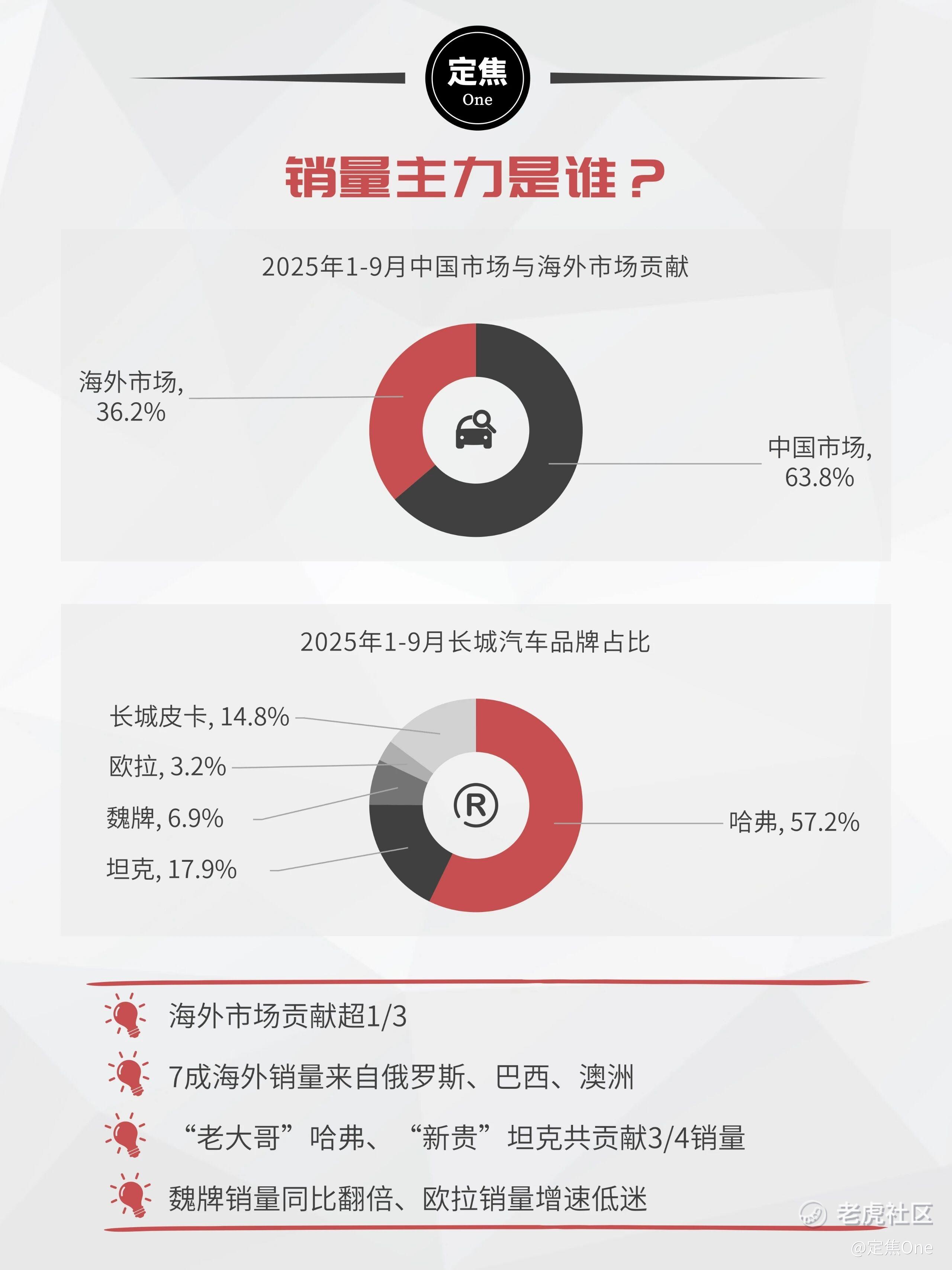 再看销量结构,长城汽车是“两条腿”的战略。首先是新能源化,长城汽车前三季度的新能源车销量占比已经达到了30.2%,其中插电混动车型(PHEV)更是占了62%,是新能源转型的绝对主力。其次是国际化,海外市场贡献度高达36.2%,接近国内市场的一半,俄罗斯、巴西、澳洲是前三大主销区。分品牌看,哈弗和坦克依然是绝对的销量担当,合计占比超过75%,销量同比翻倍的魏牌也成为一大亮点。