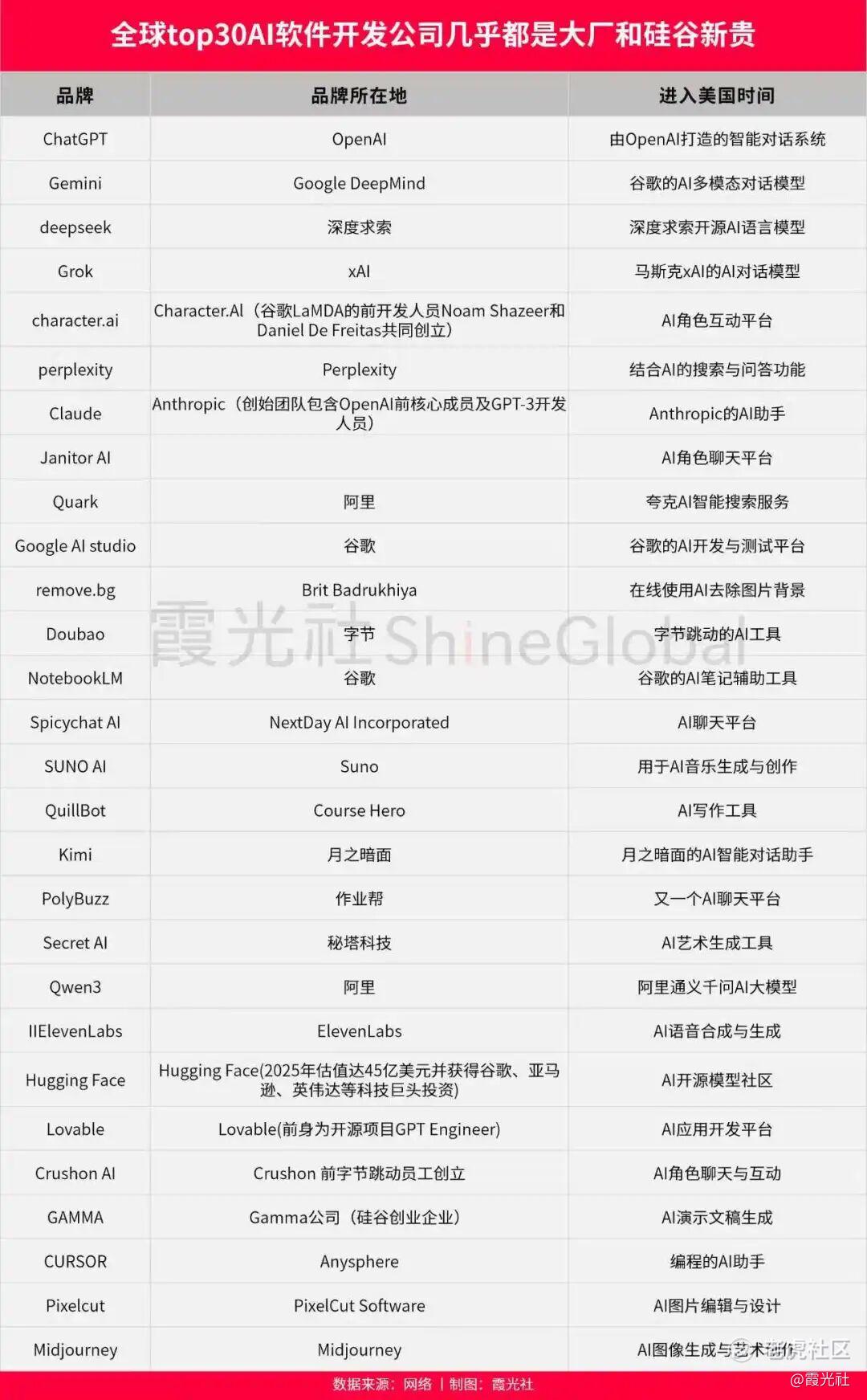 统计2025年8月a16z发布的第五版互联网AI产品TOP50榜单,排名前30的软件也几乎被硅谷科技巨头、硅谷创业产业和国内互联网大厂包揽。