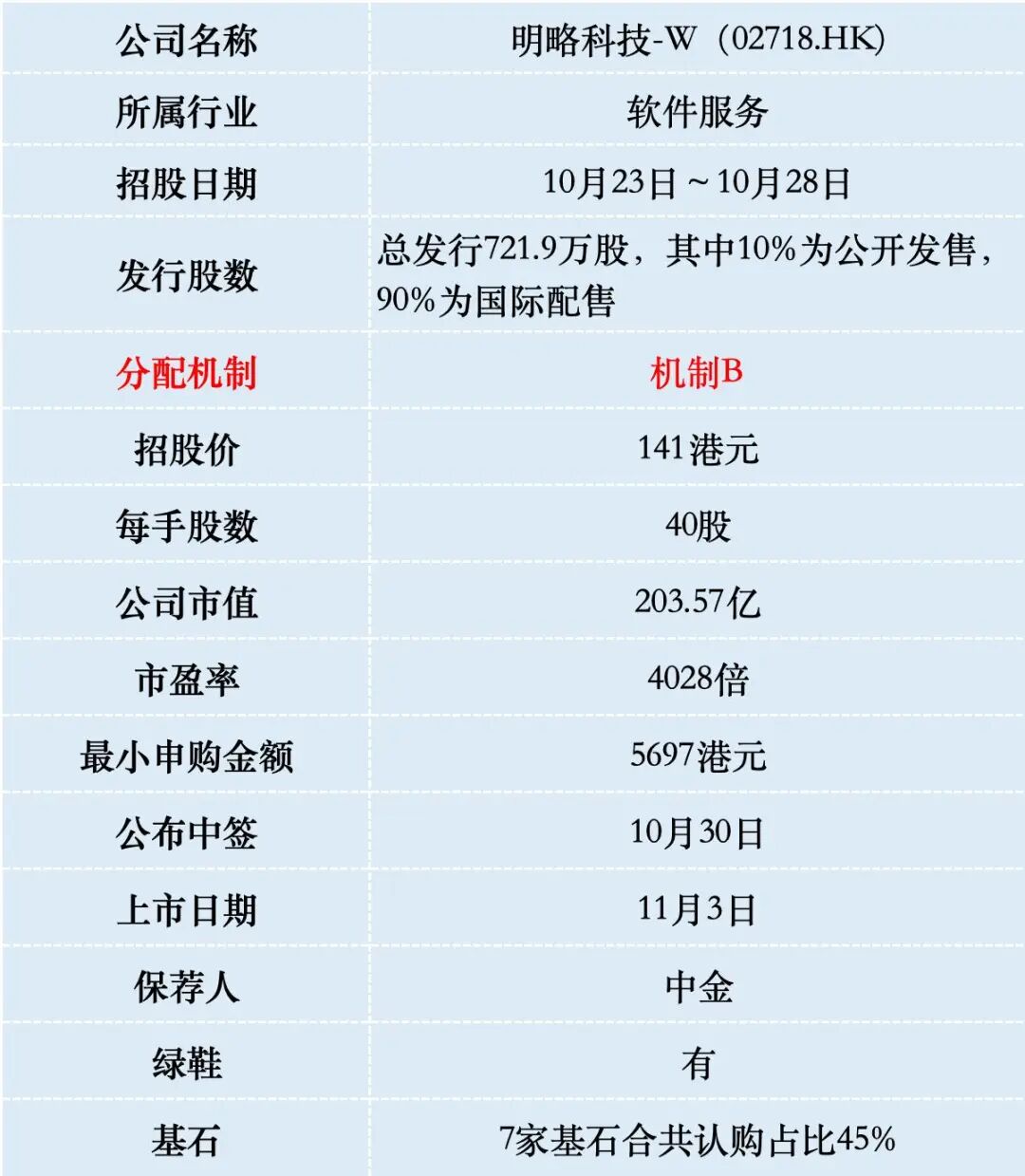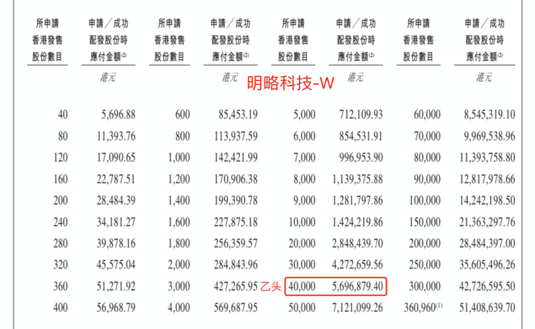 明略科技目前孖展22倍,最终大概率会超购3000倍,甲乙组各9023手。按照25万人申购算,预估一手中签率1%,甲组全部抽签。