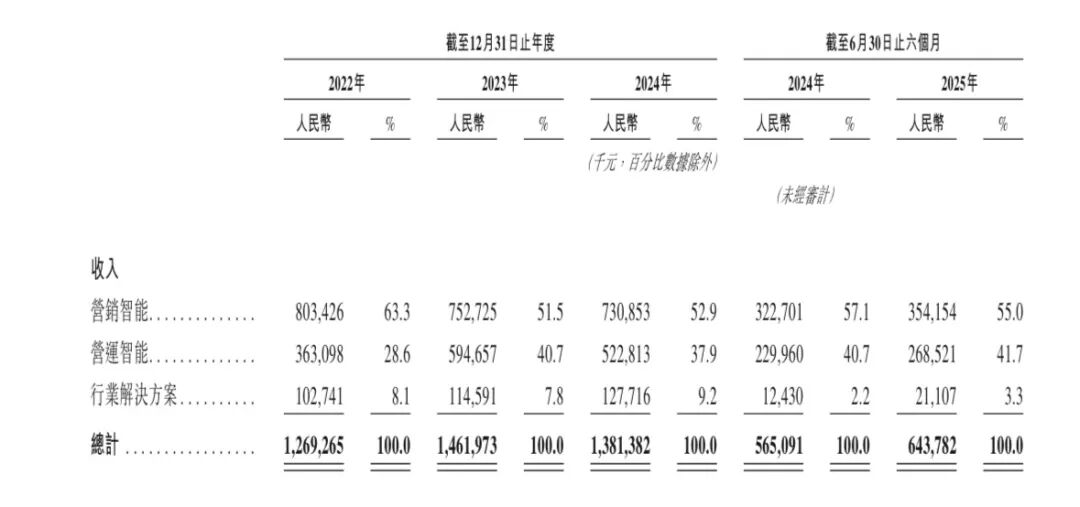 从收入结构看,营销智能业务是公司主要收入来源。2025年上半年,营销智能业务收入为3.54亿元,占总营收的55%;营运智能业务收入为2.69亿元,占比为41.7%。