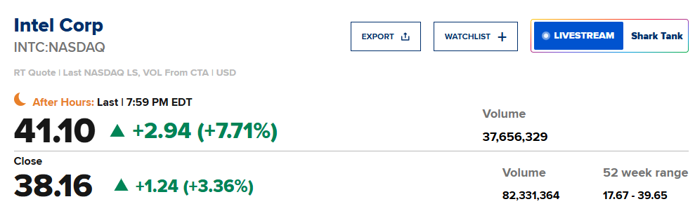 周四盘后,英特尔(INTC)在发布第三季度财报后,股价强势反弹。在常规交易上涨3.36%后,盘后更是跳涨7.71%,报41.10美元,刷新近一年高位,反映出市场对这家老牌芯片巨头复苏的信心正在加强。
