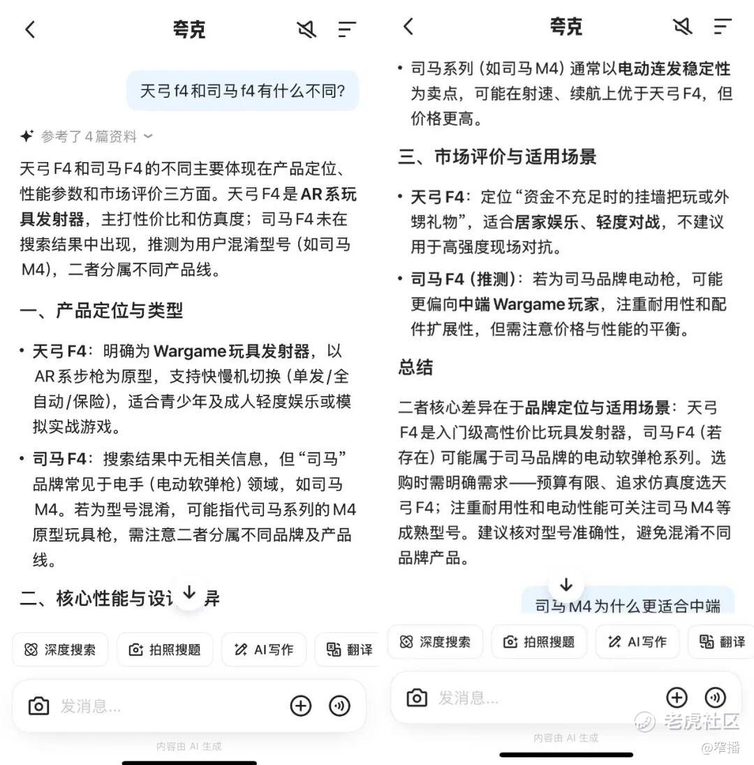 在形态切换之外,夸克对话助手的回答效果也有了很大的提升。我问了夸克对话助手一个「天工f4和司马f4有什么不同」的问题。首先,这是一个小众的水弹发射器的问题,很多人甚至都不知道天工和司马是啥;其次,这个问题中的司马f4写错了,应该是司马M4。