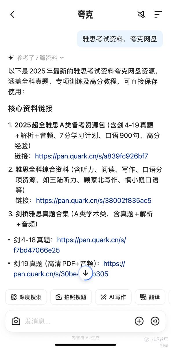比如,我最近在准备出国留学,于是让夸克帮我搜索全网的雅思考试资料,它不仅能找到最新、最优质的内容,还就能够直接提供网盘链接,一键转存到自己的网盘进行资料整理。