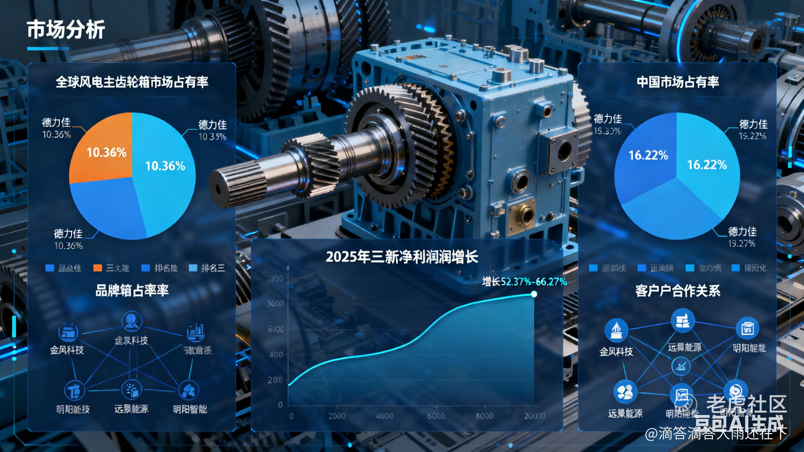德力佳是风电主齿轮箱领域的全球领先供应商。根据QY Research的数据,2024年其全球市场占有率为10.36%,排名第三;中国市场占有率为16.22%,排名第二。公司与金风科技、远景能源、明阳智能等头部风电整机企业建立了稳定的合作关系。值得注意的是,2024年因主要客户远景能源转向自产,对其销售规模有所影响。不过,公司预计2025年前三季度净利润将大幅增长52.37%至66.27%。