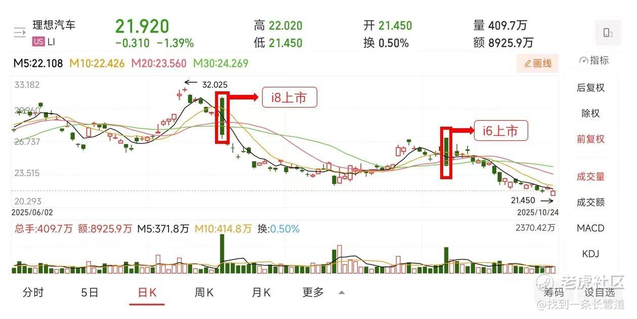 理想汽车股价最近的走势真的太差了,可以说:它一碰【纯电】股价就跳水、打折……从去年的mega发布(狂跌62%),到今年的i8和i6都无一例外!